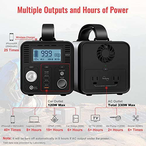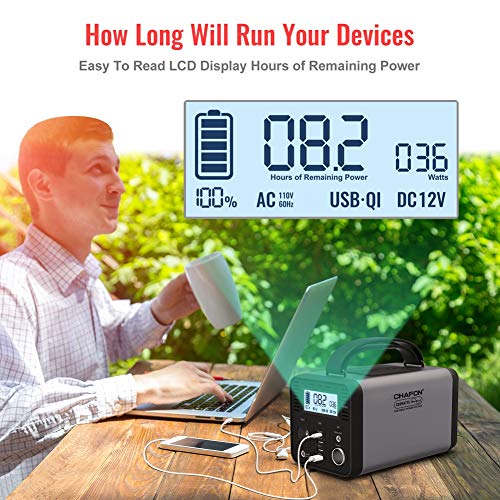 - LATEST LCD Display: CHAFON Lithium Battery Generator CF290 is equiped with 296 watt-hour(20Ah,14.8V/80Ah,3.7V) lithium-ion battery pack,enough charge a iPhone8 (2658mAh) 28 times,MacBook Air(30W,PD use) 9+ hours,Resmed Airsense 10 CPAP( 12w with DC converter) 3+ nights,mini-cooler Dometic CFX35W(12v,0.77 Ah/h) 24+ hours or other under rated 330W electronics,mini heater,printer,fan,drone,TV etc,when you plug the device,easy to read the duration on LCD.