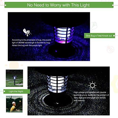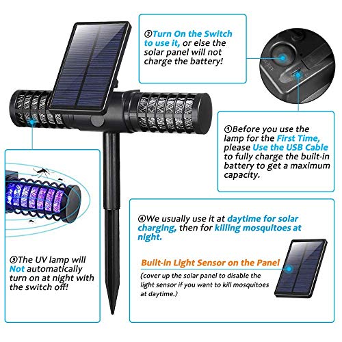 - Efficient:The solar mosquito killer lamp utilizes a high frequency UV light which is proven to be the most effective, to lure flying insects during the day or night to from a practical,efficient,hygienic and automatic electronic insect extermination system.