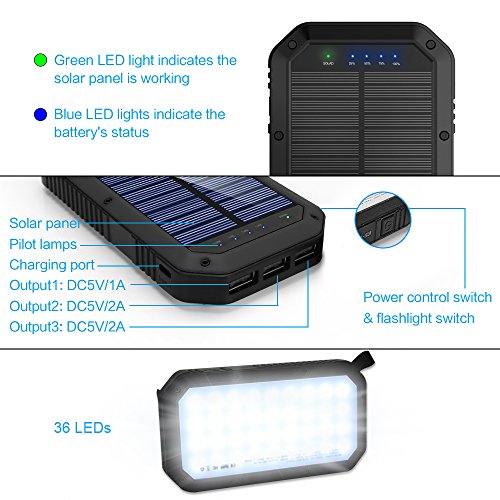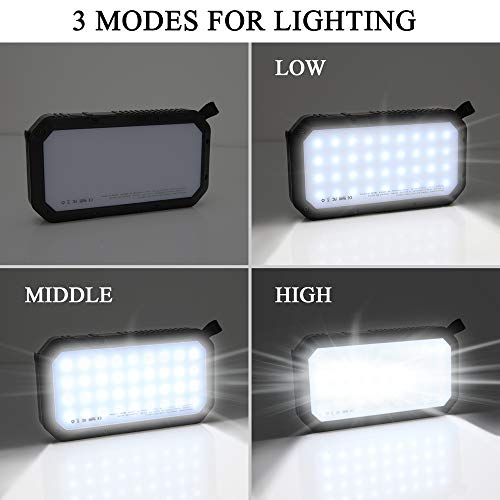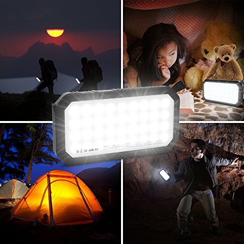 - 【ABS Material with 36 LEDs】The USB power bank used ABS environmentally friendly material, stylish and decent. Built-in 36 LED lights with powerful lighting function,this solar phone charger is the best choice for outdoor enthusiasts.