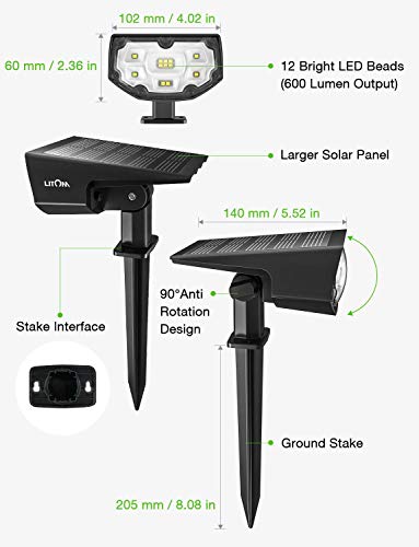 - Upgraded Pro Solar Landscape Lights: Big change from the previous version. The light head (115 ° adjustable) and solar panel (45 ° adjustable) adjust independently, both can direct to where you want at the same time, maximize solar absorption rate and obtain the best lighting angle. Comes with an extension arm, the total height of the light is up to 46cm, higher and thickened, which is more stable and will not be covered in the grass.
