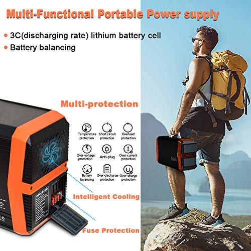 - 【Multi-Functional Portable Power Station】while camping outdoors travelling,or CPAP Power Supply or home outages; The portable generator power station has OLED screen with display charging/discharging and battery life status;the Emergency Portable Generators work with laptops phones,drones, car refrigerator, camera,coffee machines and etc. 25.4Ib, 2 AC outlets, 2* 12V 8.0 (MAX) DC port, 4* USB 5V 3.0A (MAX) port.