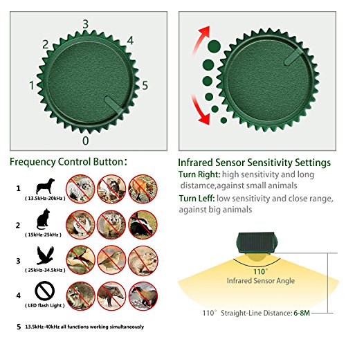 - 【Motion Sensor】Once animals enter the protection range, the PIR sensor starts to work, then it will emit ultrasonic waves and the red light will be turned on so that it repels the animal.