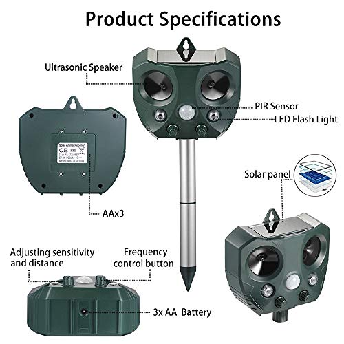 - 【Humane & Safe】 Release ultrasonic signals to disturb animal’s neuro-system which do no harms to human, thus can drive them away in a safe way. No chemicals! (Signal is unpleasant to animals but inaudible to humans.)